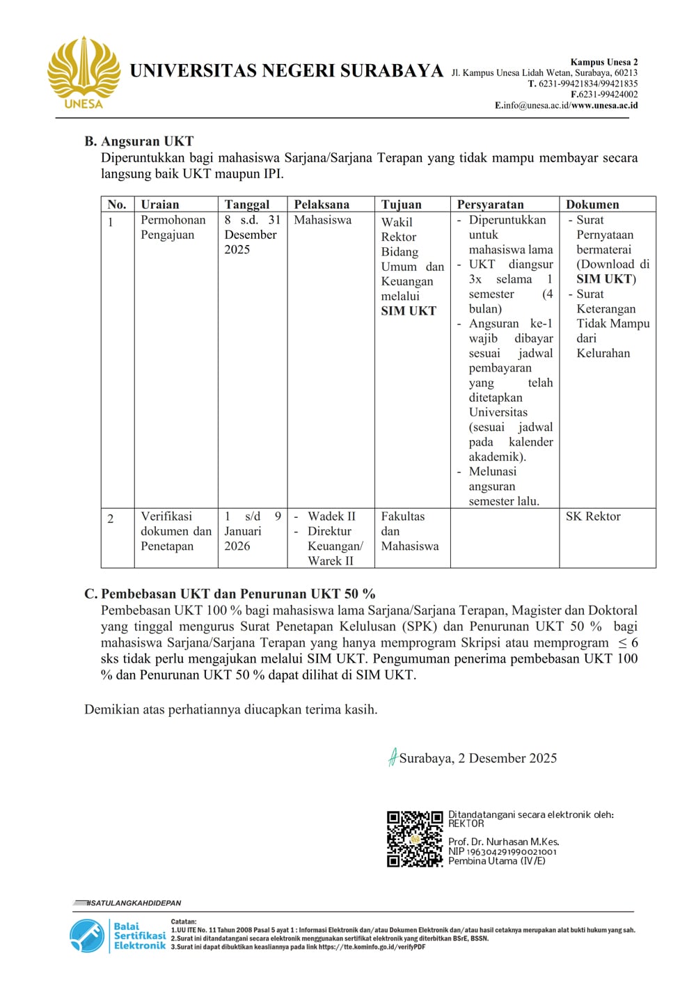 2. Bagi mahasiswa yang membutuhkan penyesuaian, seperti angsuran atau permohonan keringanan UNESA menyediakan mekanisme melalui sistem resmi yang berlaku.